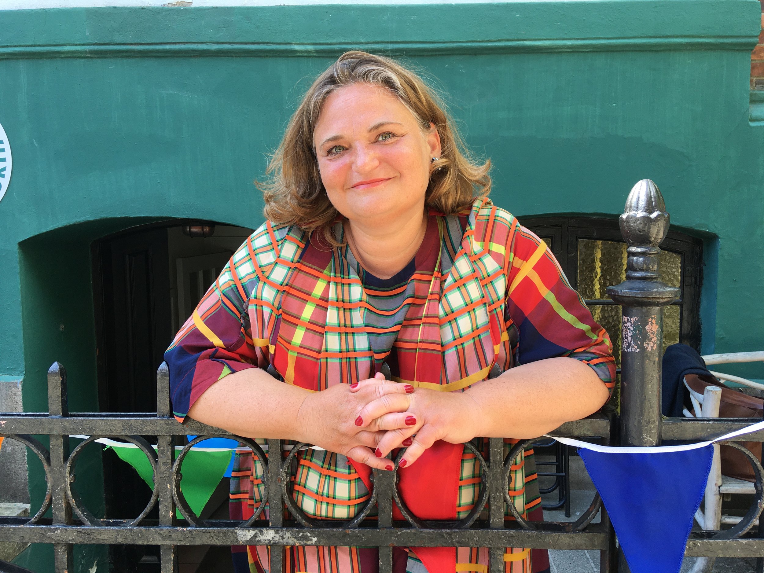 Foto af Karen Siercke taget på Borgerlysts 10 års fødselsdag, hvor jeg under pandemien havde arrangeret en storstilet skattejagt med levende poster på Nørrebro.